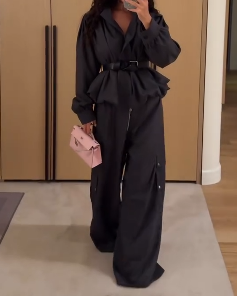 Long-sleeved Pleated Top and Pants Solid Color Two-piece Set Without Belt